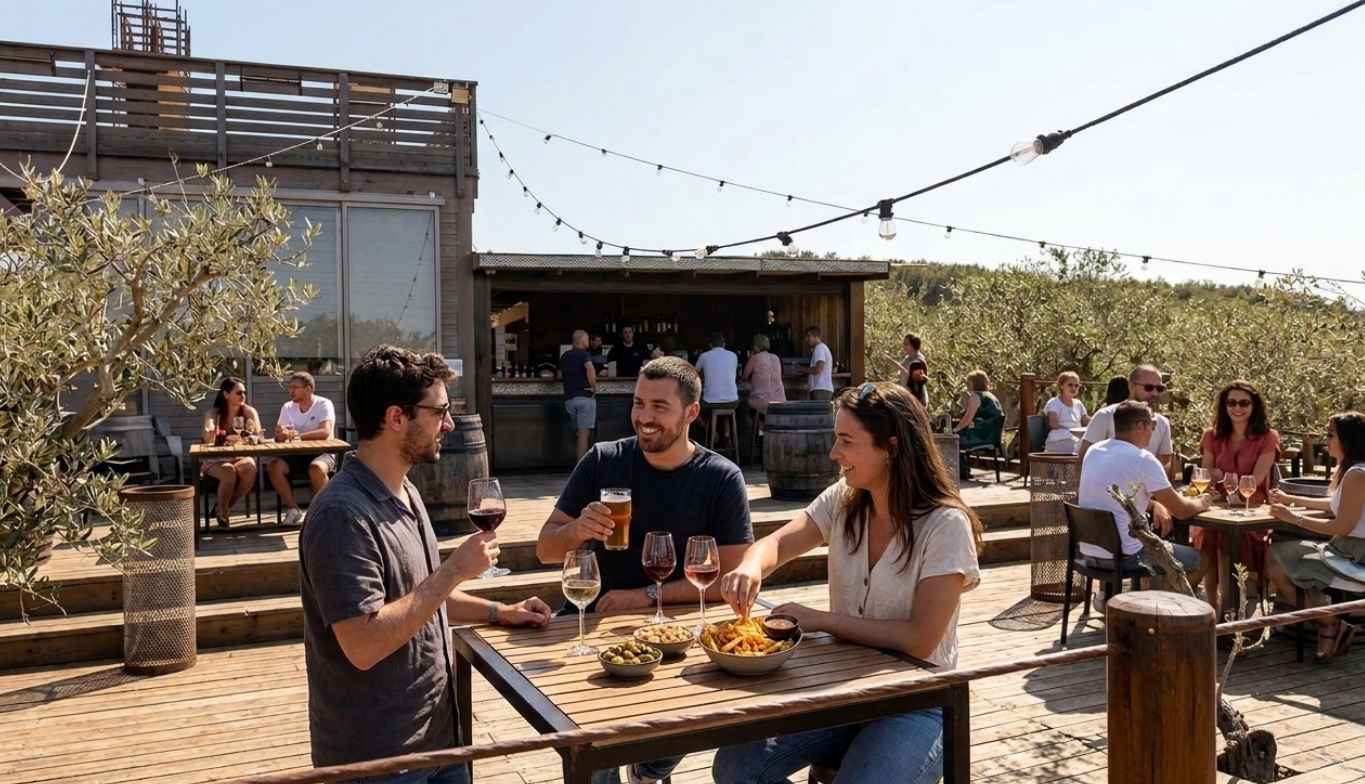 Cette année, nous avons construit une belle terrasse en bois au cœur de nos oliviers et à proximité de notre nouveau bar. Un lieu où vous aurez accès, en toute autonomie, à votre apéritif, en effet, vous pourrez en effet commander vos boissons directement au bar.